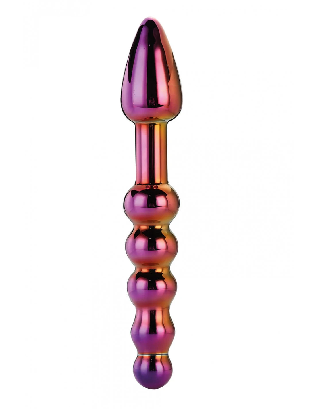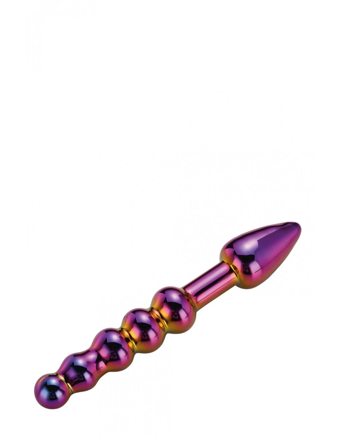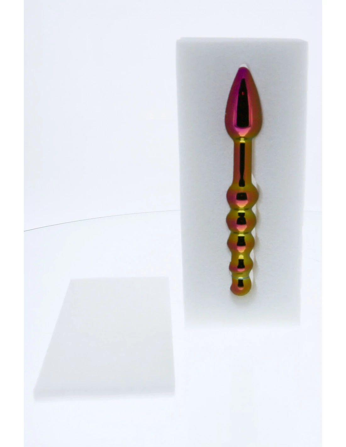Een uiteinde met een conische vorm en een taps toelopende punt voor eenvoudig inbrengen. Het andere uiteinde heeft ribbels die 5 kralen vormen die groter worden.