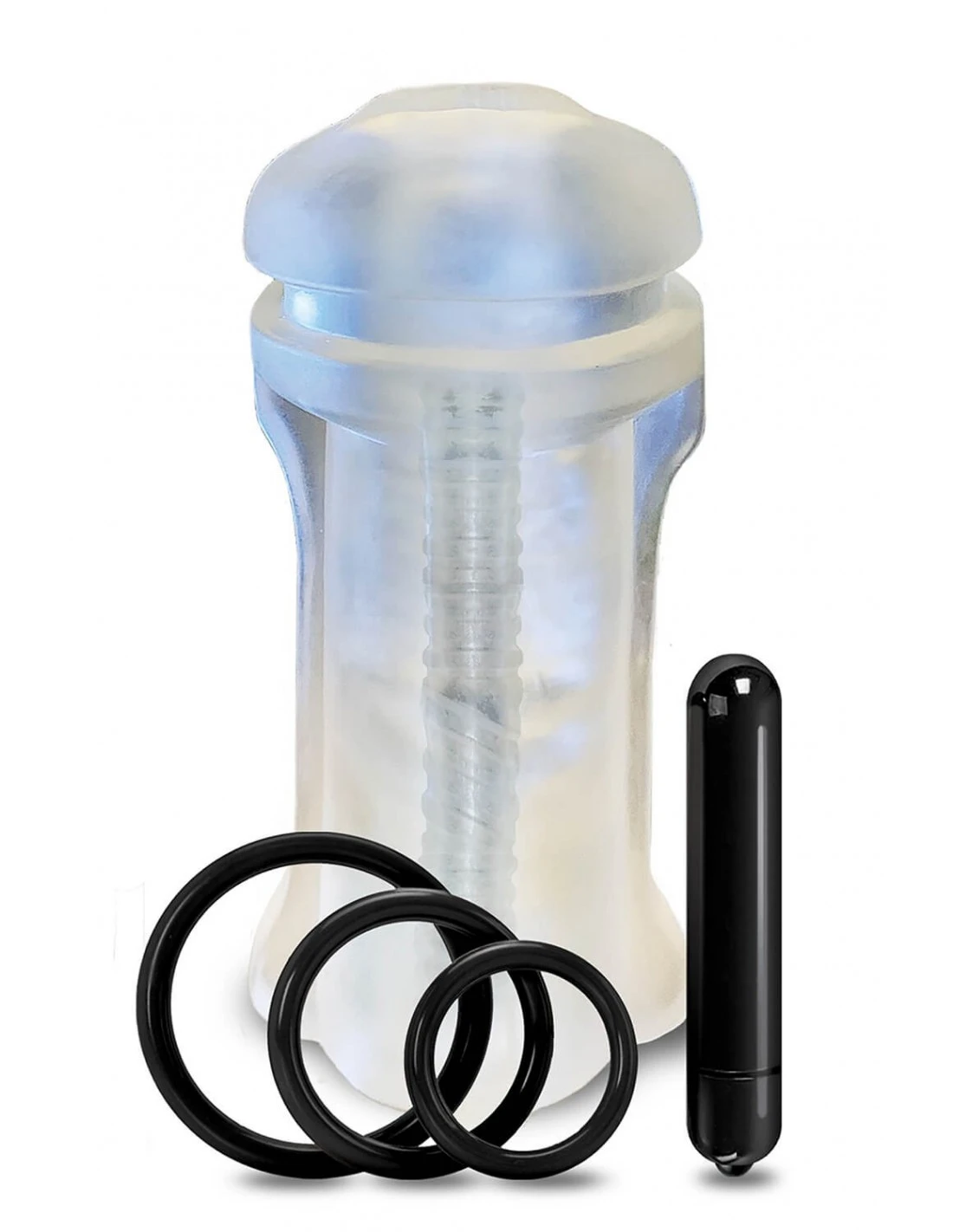 De MSSTRB8 Vibrating Stroker Oral pack “Lip Service” bevat een stroker, een waterdichte kogel voor de vibraties en 3 penisringen.