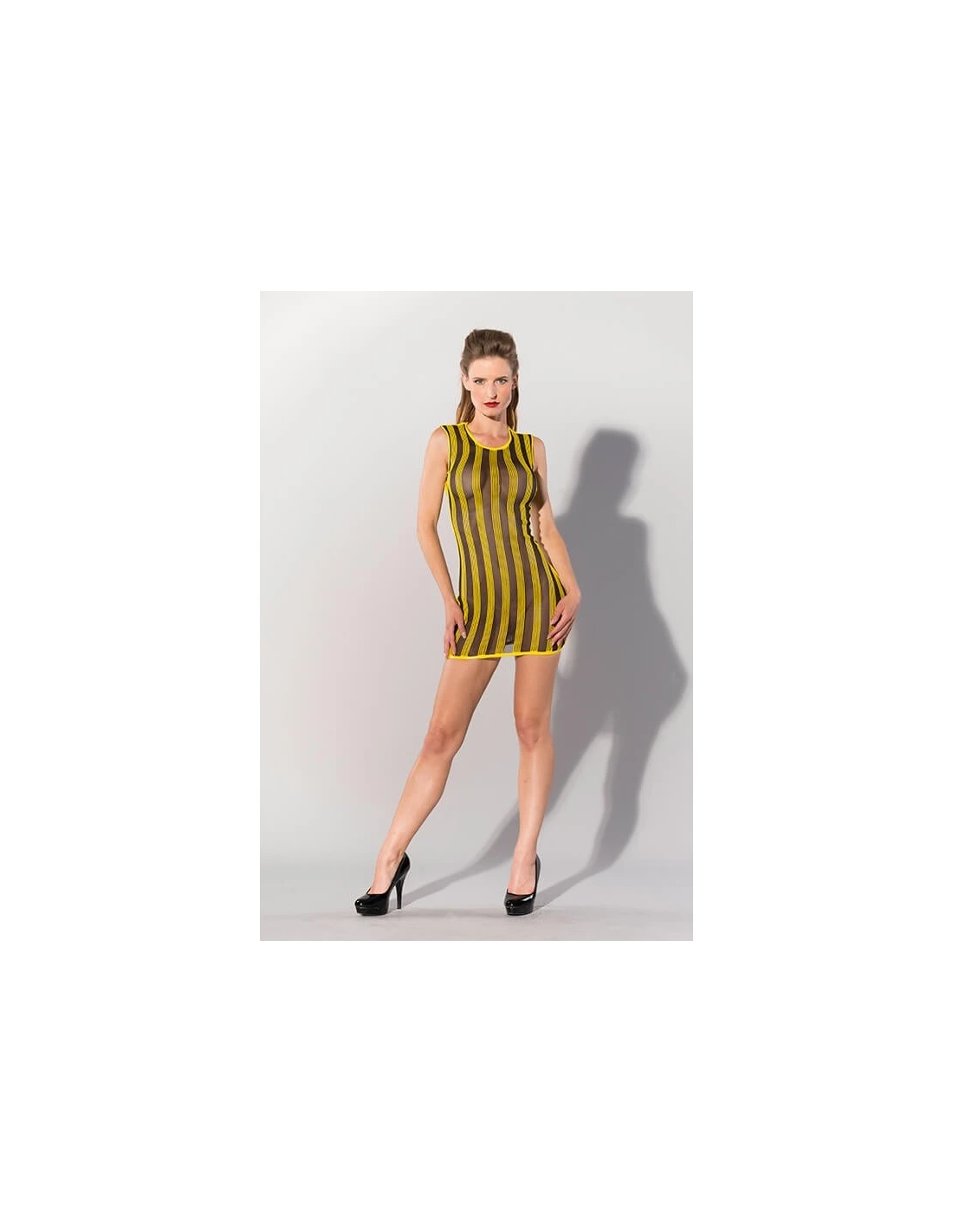 De gele strepen zijn latex geprint en geeft de jurk een unieke look.